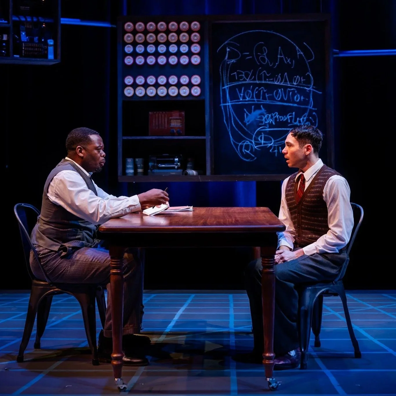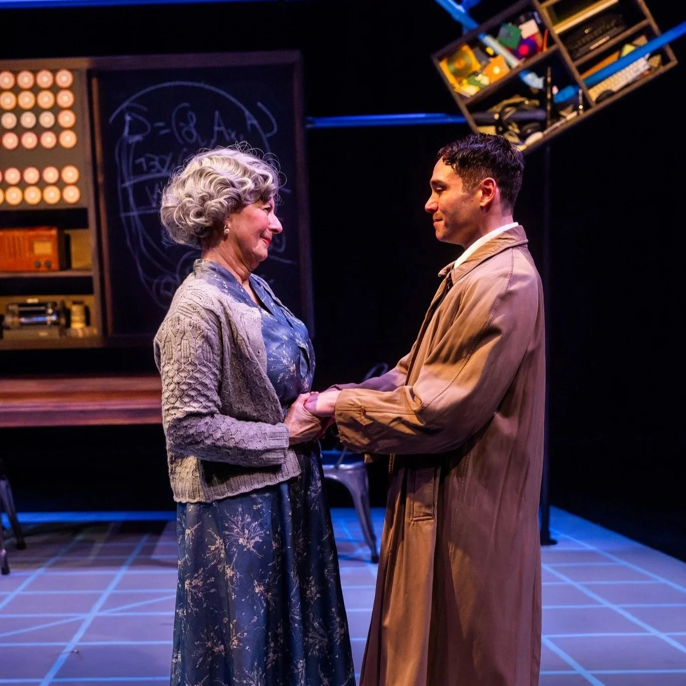 Shields is surrounded by an equally stellar supporting cast. Paula Plum (Sara Turing) and David Bryan Jackson (John Smith, Dillwyn Knox) are delightful and believably British in both voice and physicality. Matthew Beagan brings confidence and charm to his four very different–and distinctly portrayed–roles. Josephine Moshiri Elwood exudes warmth and kindness as Turing’s friend and fellow mathematician, Pat Green. And Dom Carter brings a quiet sympathy to the role of Mick Ross, the investigator.