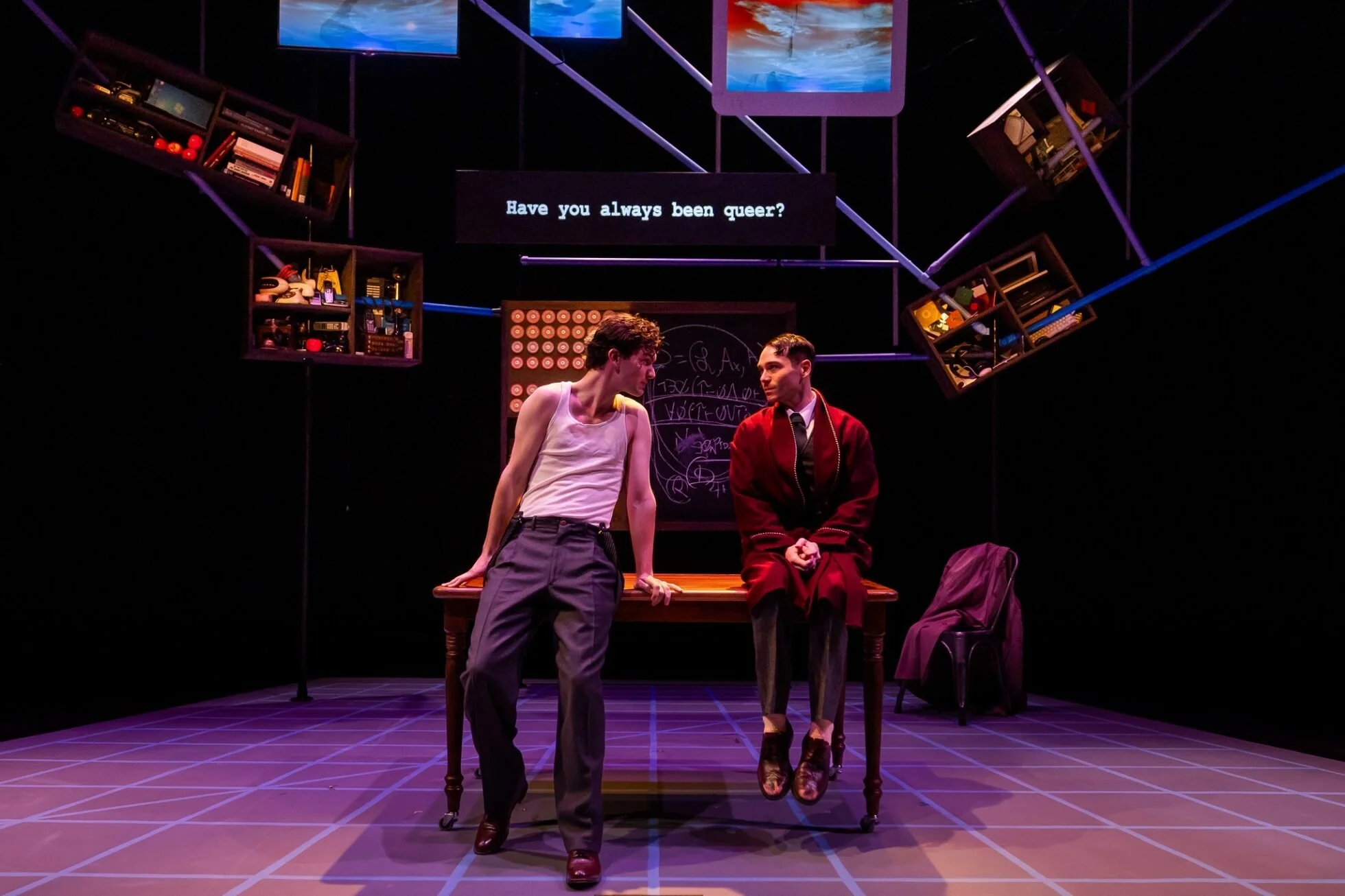 Of particular note was Janie E. Howland’s set design, which is spare but intriguing. With no walls, nothing is being concealed. Symbolically, this works well in a play that centers on an interrogation of Turing’s homosexuality–something he refuses to hide. Shaped like an isosceles trapezoid (for the non-math nerds, trapezoids are often used to explore angles or, in this case, thoughts), a backdrop of TV screens is connected by scaffolding and strips of bright neon light. The five screens are meant, perhaps, to symbolize the five major parts of the brain, with each screen displaying images that change along with Turing’s thoughts, memories, ideas, and feelings. The acting space on the floor mirrors the shape of the webbed screens above and gives the impression that the entire play is taking place inside of Turing’s mind. This becomes all the more clear when he describes a recurring nightmare in which he is “trapped inside an enormous mechanical brain.”
