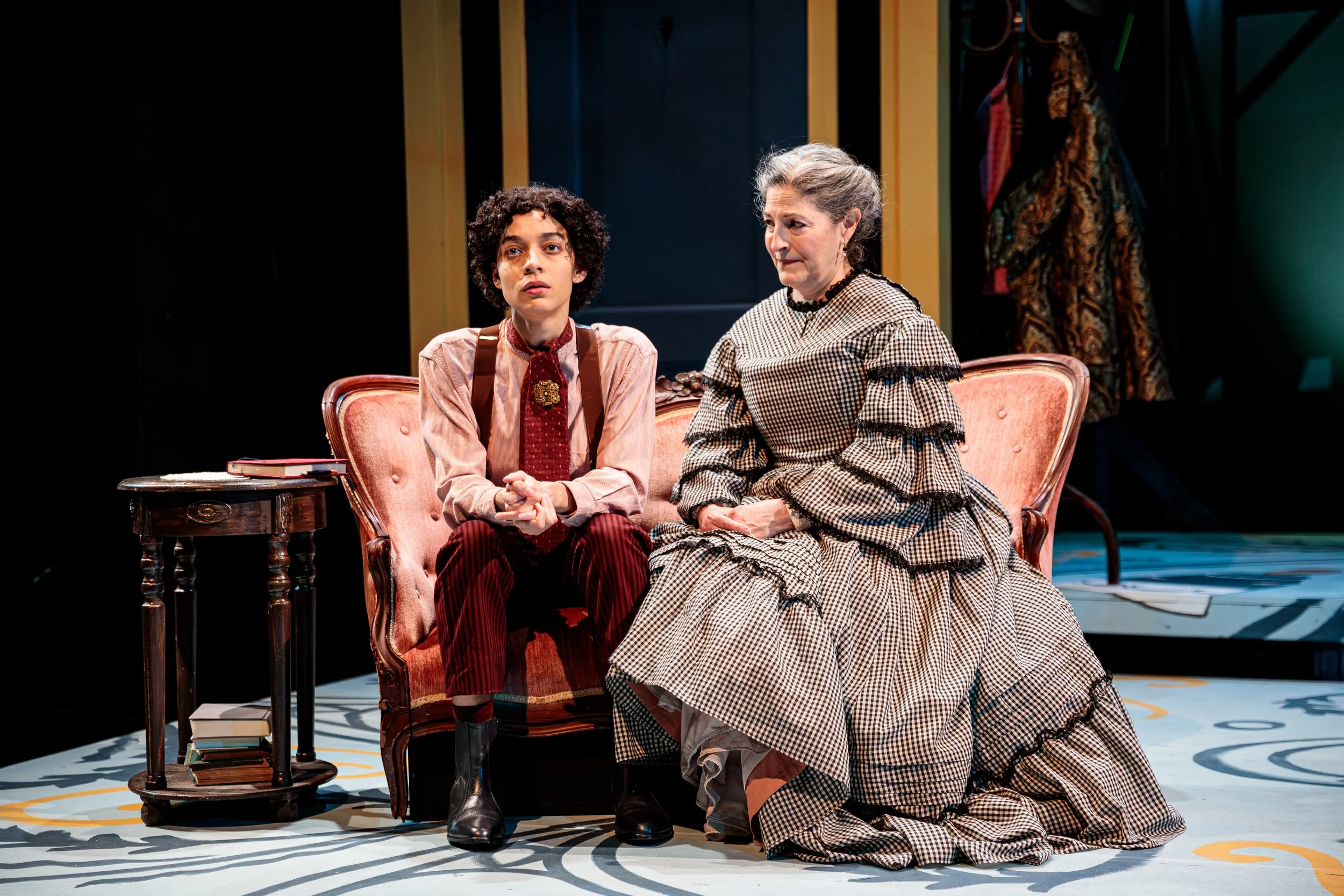 Costume Designer Zoe Sundra highlights Jo’s “difference” in Act I by putting the character in heavy boots, high-water patchwork pants, and a baggy plaid shirt. In Act II, Sundra brilliantly elevates Jo’s style to include red pinstripe pants, a fitted peach button-up shirt with a red cravat, maroon suspenders, and a tophat. Sundra’s design for the other March sisters is just as intentional. Her thoughtful choices easily give you a sense of who the characters are, using mismatched colors and patterns with tired, faded fabrics to draw attention to the family’s financial hardship. Meg’s muted mustard skirt has six-inches of blue fabric stitched on the bottom, which suggests that that was a more affordable option than buying a new skirt. Beth’s girlish pink dress is several inches too short, revealing her white bloomers underneath. And Amy’s clothes, while still modest, appear more put together with flattering, matching colors and form-fitting shapes.