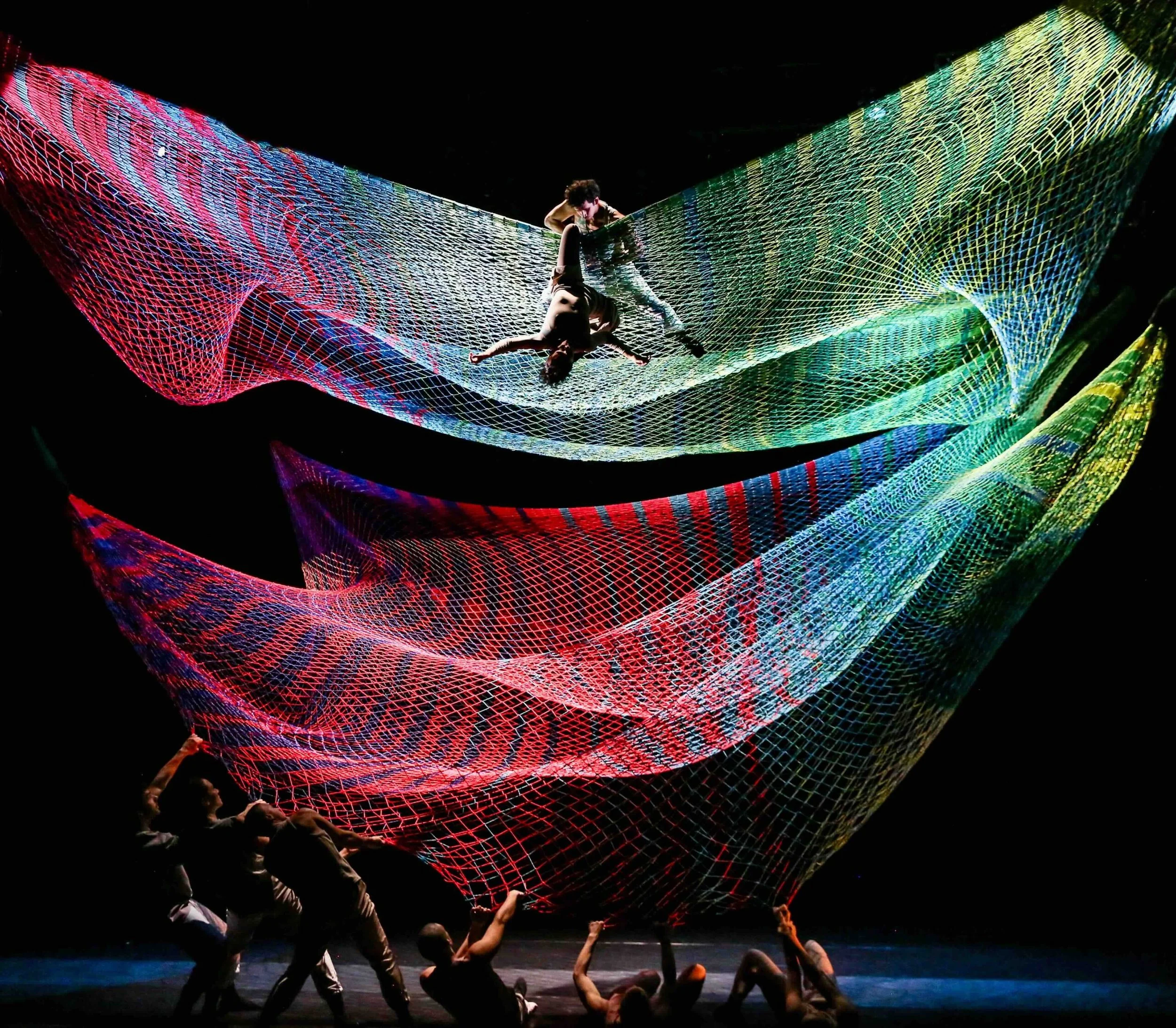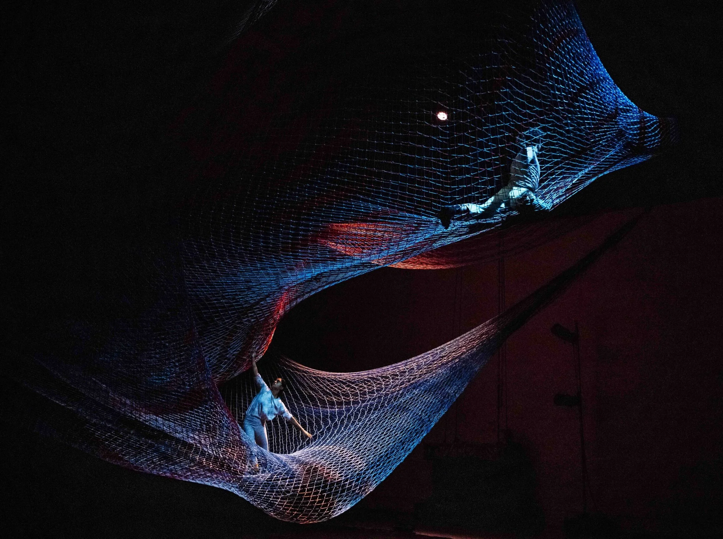 ArtsEmerson’s Noli Timere is a deeply moving exploration of trust and connection through the fusion of art, music, circus, and dance. Over the course of one thoroughly thrilling hour, eight performers take you on a gravity-defying emotional journey through a large-scale fiber art sculpture suspended 25-feet above the stage.
