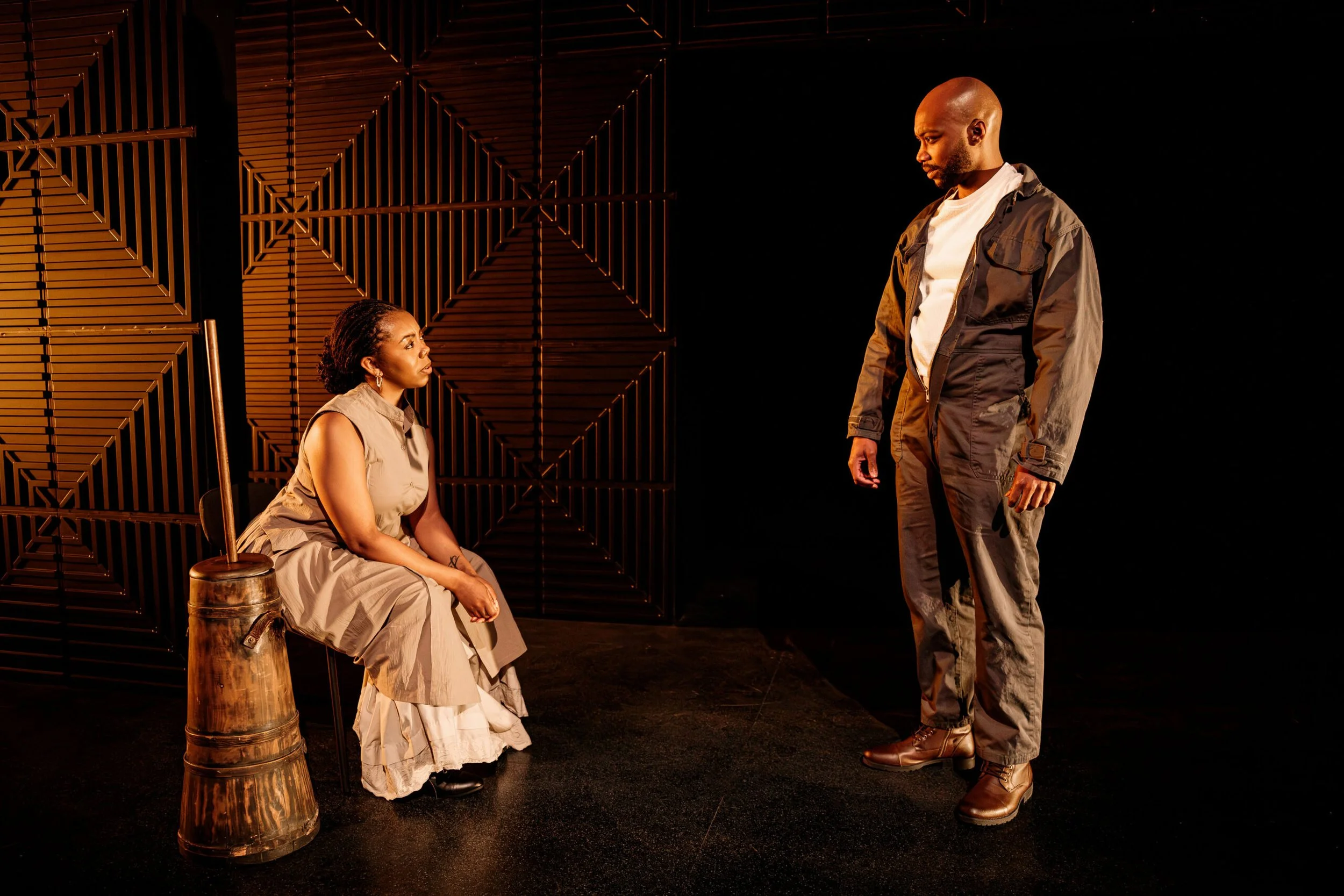 Following the playwright’s request that “scenery should be minimal,” scenic designers Christopher and Justin Swader created a cold, unmoving set comprised mostly of hard, cage-like walls. This, paired with Amanda Fallon’s subdued lighting design, makes for a dark, unfeeling– and inhuman– world inside the museum.