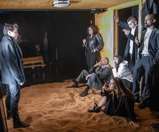 As you walk up the stairs into Studio 368, the home of the Arlekin Players, and into the intimate black box theater, you feel a sense of uncertainty: the space is separated into three sections with two seating areas to choose from – one on the left and one on the right – with the performance space placed directly in the center of the room. There is a wooden arch with two black doors on either side and a large circle of sand in the middle of the floor. The space feels ominous- the only light emanating from the floor and from a few naked bulbs on the wall. You take a seat and you wait.